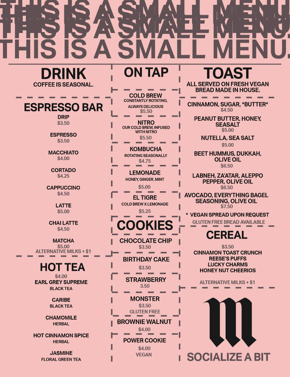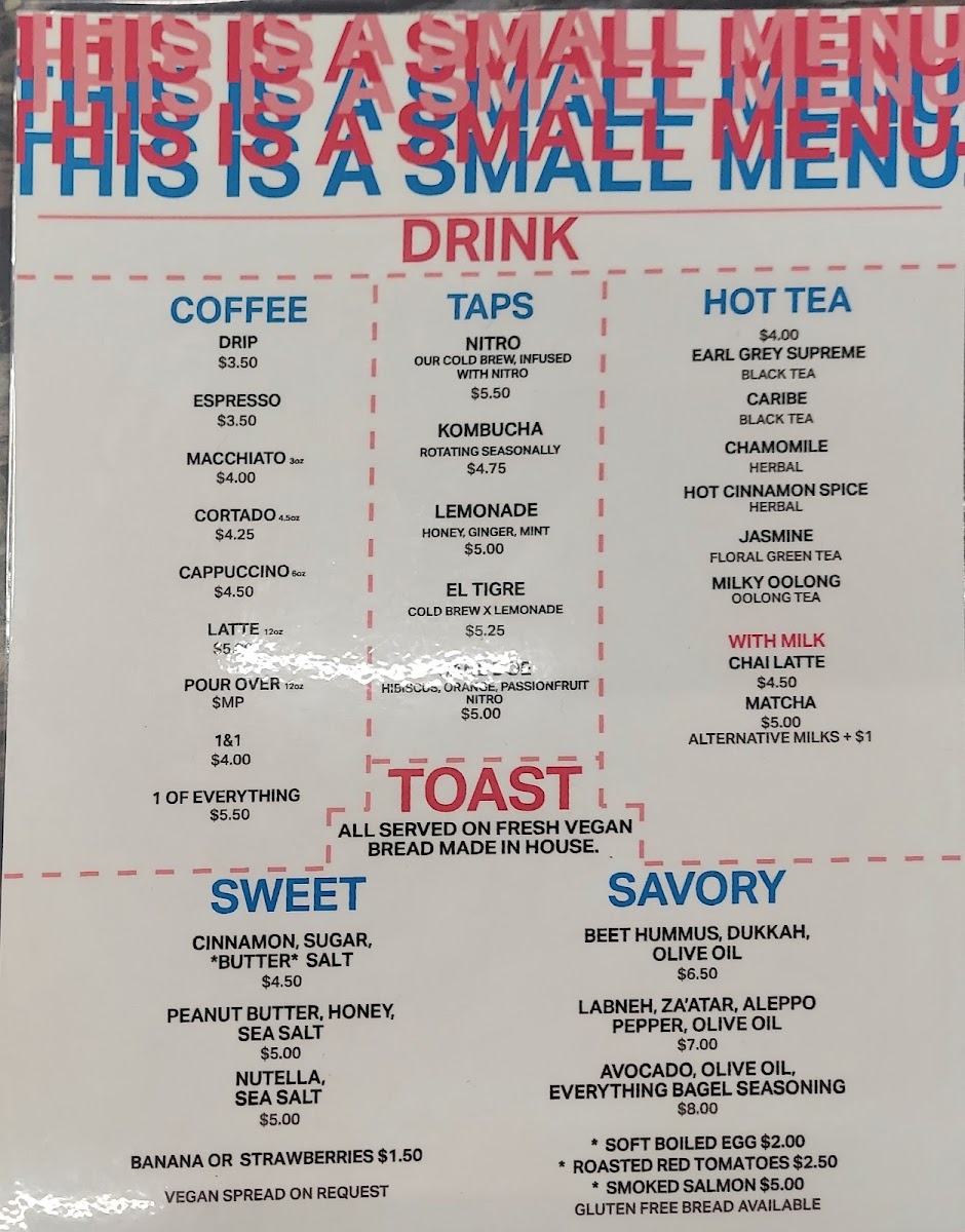 This menu suits those looking for a relaxed atmosphere where quality and simplicity meet. It’s a place to enjoy a casual breakfast, a light lunch, or a leisurely afternoon break with familiar flavors presented thoughtfully. The mix of house-made beverages, fresh baked goods, and seasonal specialties invites visitors to savor everyday moments in a welcoming, easygoing setting.