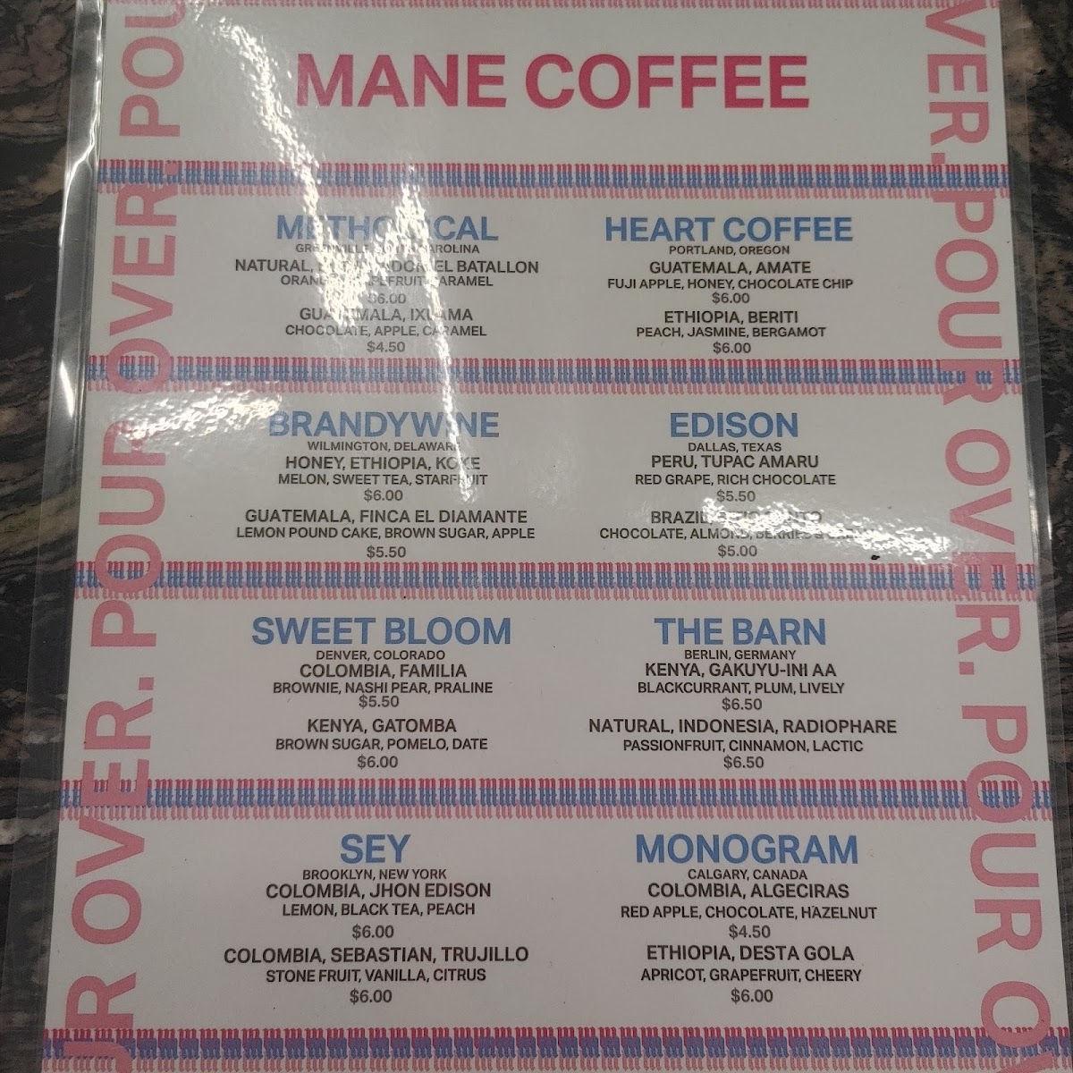 The menu at Mane Coffee offers an inviting selection that balances thoughtful coffee craftsmanship with simple, approachable bites. Here, you’ll find a range of carefully prepared espresso drinks and unique pour overs alongside fresh breakfast and lunch options that feel both comforting and a little unexpected.